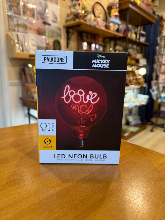 Cette ampoule LED néon Mickey Love met à l’honneur l’univers intemporel de Mickey Mouse à travers un filament lumineux en forme du mot Love, subtilement inspiré de la célèbre silhouette aux oreilles iconiques. Visible à travers un large globe en verre transparent, elle devient un véritable élément décoratif, même éteinte.