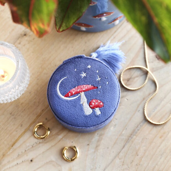 Plongez dans un univers féerique avec cette boîte à bijoux ronde champignons en velours bleu nuit. Sur son couvercle, de délicats champignons rouges et un croissant de lune argenté apportent une touche de magie à votre rangement quotidien.