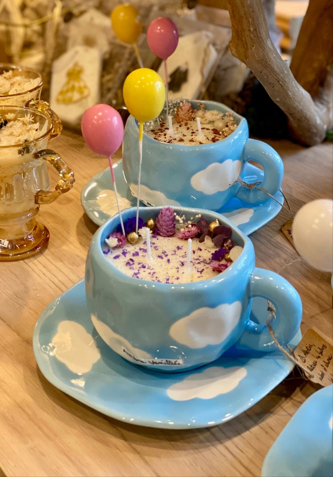 Plongez dans la poésie d’un voyage aérien avec cette bougie exclusive, coulée artisanalement dans une grande tasse en céramique ornée de nuages et accompagnée de sa soucoupe assortie. Les ballons décoratifs apportent une touche féerique et festive, rappelant l’évasion et les rêves d’enfance.