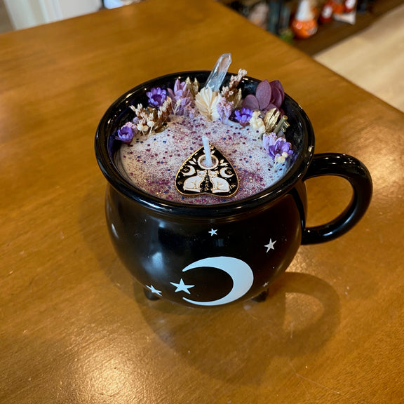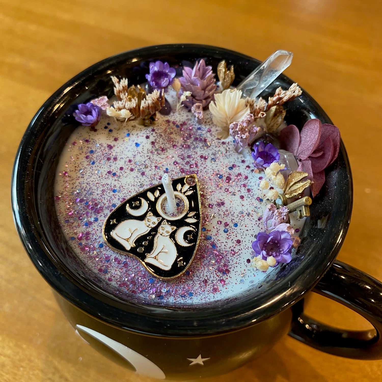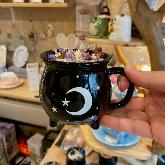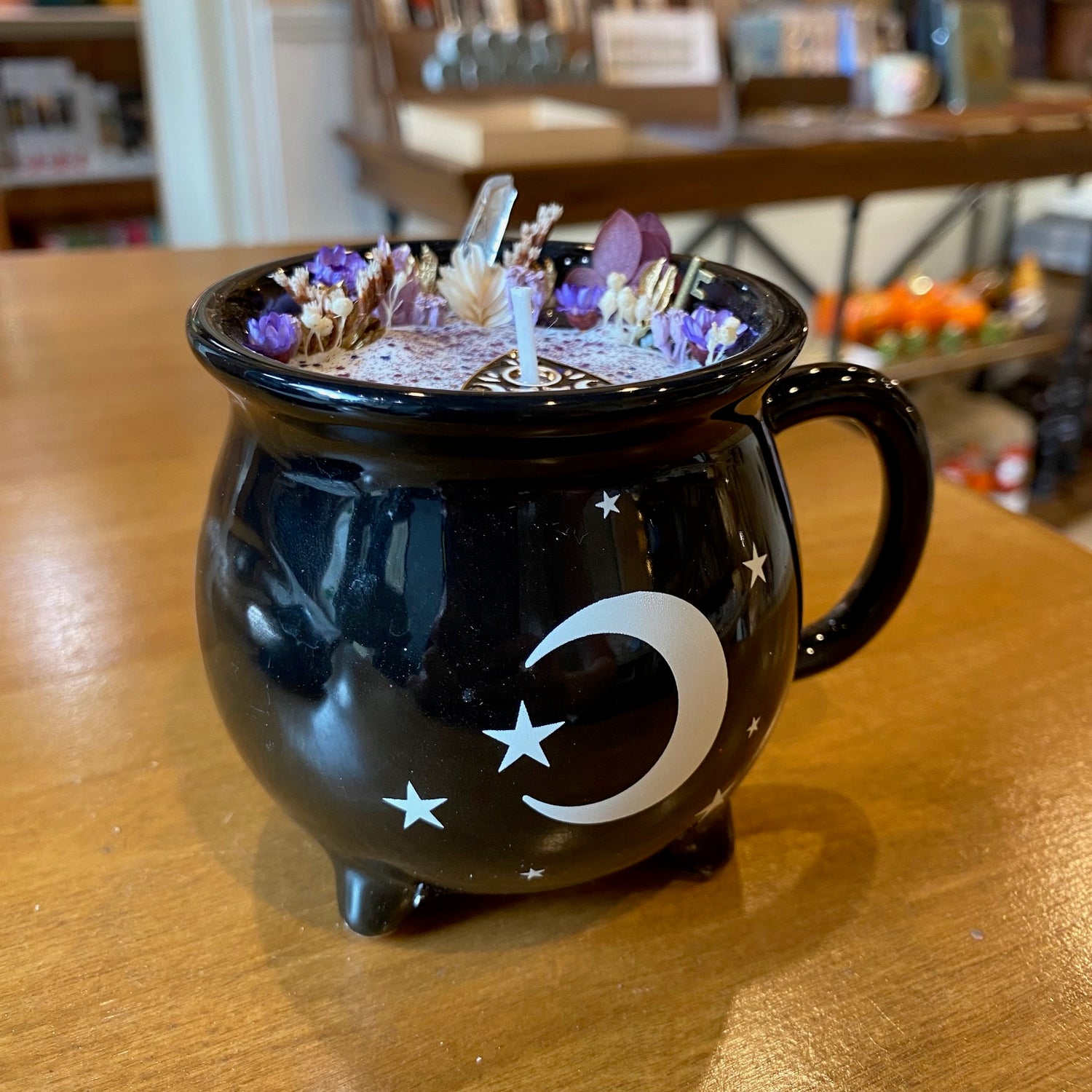 Plongez dans l’univers enchanté avec cette bougie unique, présentée dans un véritable petit mug en forme de chaudron noir orné d’un croissant de lune et d’étoiles de chaque coté. Une création exclusive Le Cerf aux Bois Dorés, imaginée comme un rituel lumineux à la fois décoratif et spirituel.