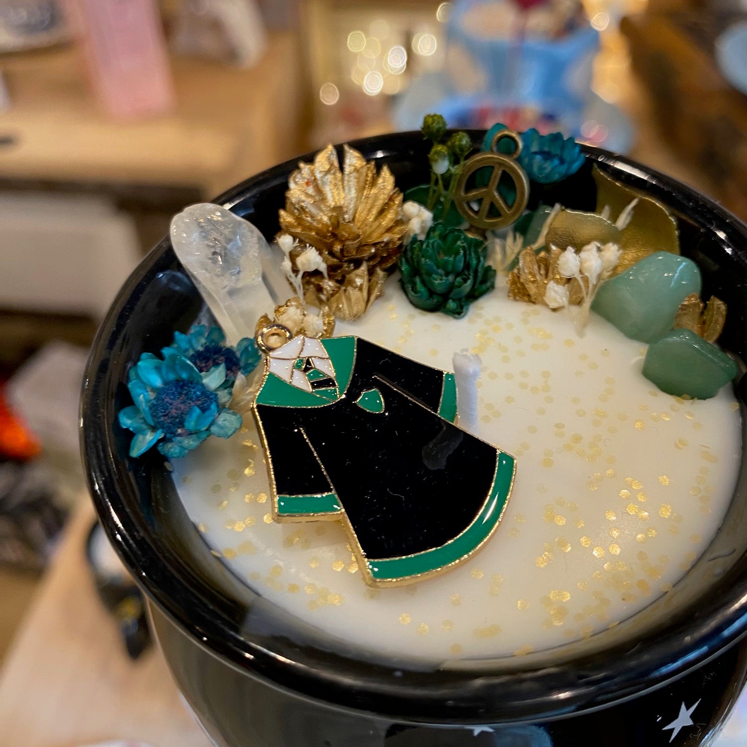 Chaque bougie est coulée artisanalement par Atelier Linou, en Normandie, avec une cire végétale naturelle et parfumée aux fragrances de Grasse. L’intérieur est décoré de fleurs séchées, de pierres fines et de breloques, faisant de chaque pièce un objet unique.