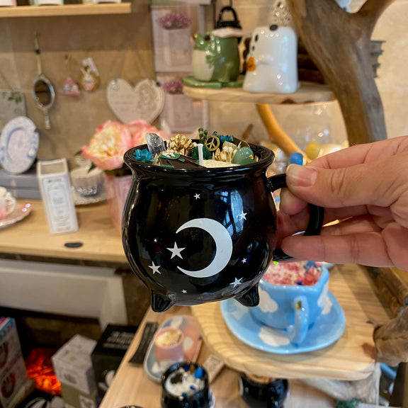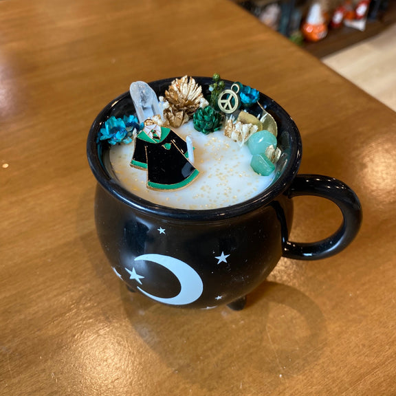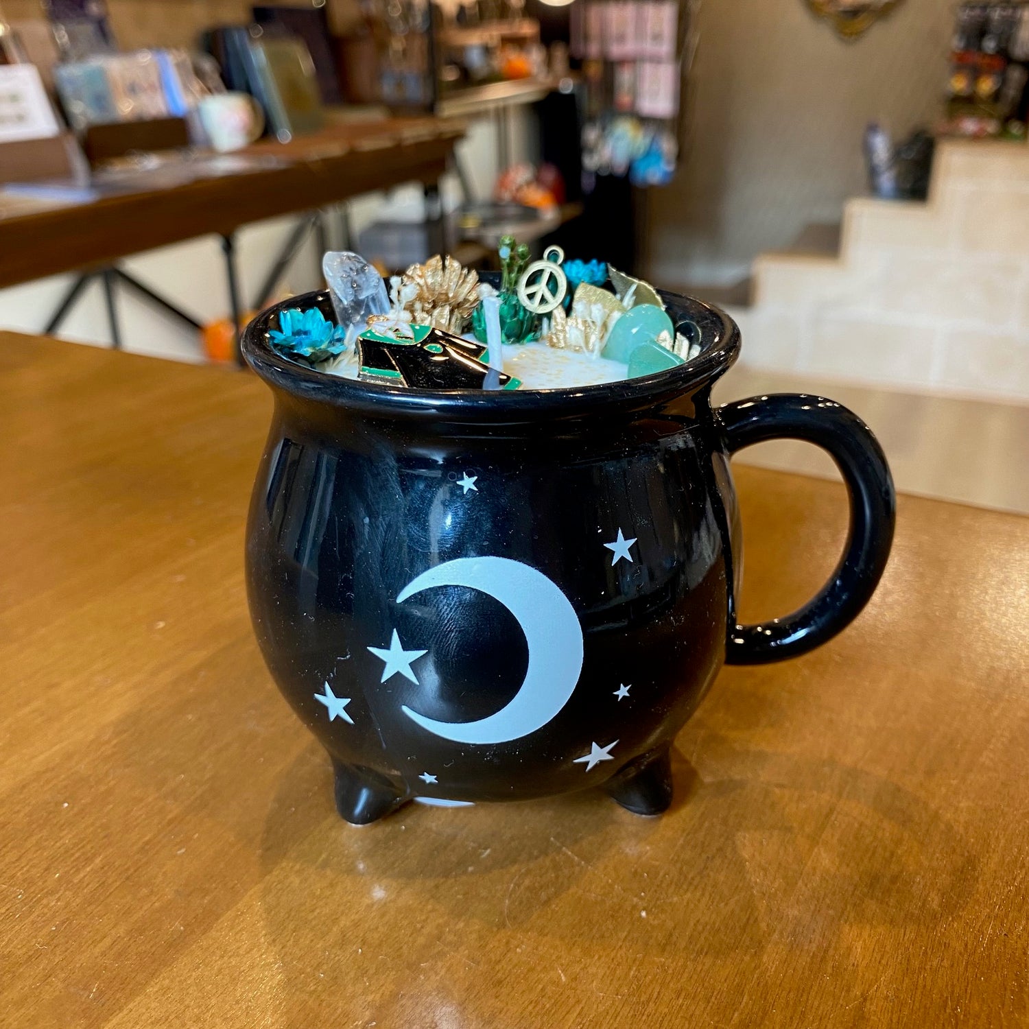Plongez dans l’univers enchanté avec cette bougie unique, présentée dans un véritable petit mug en forme de chaudron noir orné d’un croissant de lune et d’étoiles de chaque coté. Une création exclusive Le Cerf aux Bois Dorés, imaginée comme un rituel lumineux à la fois décoratif et spirituel.