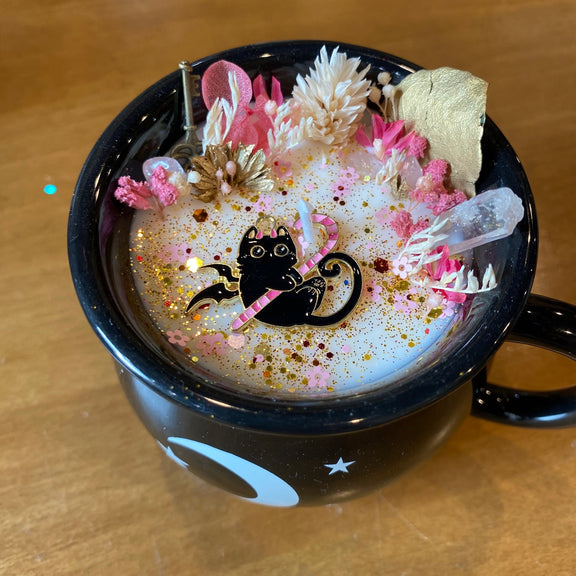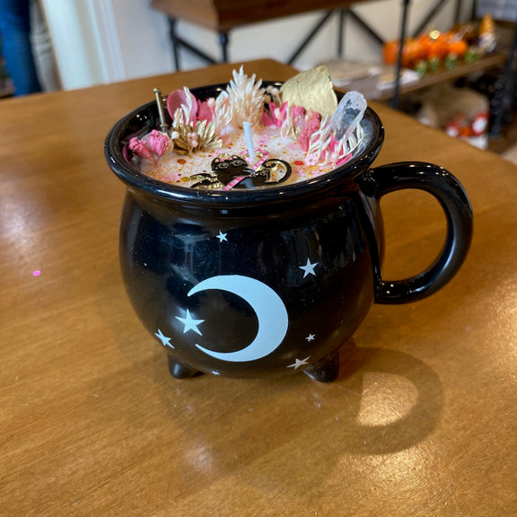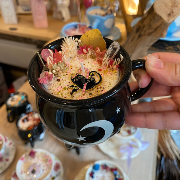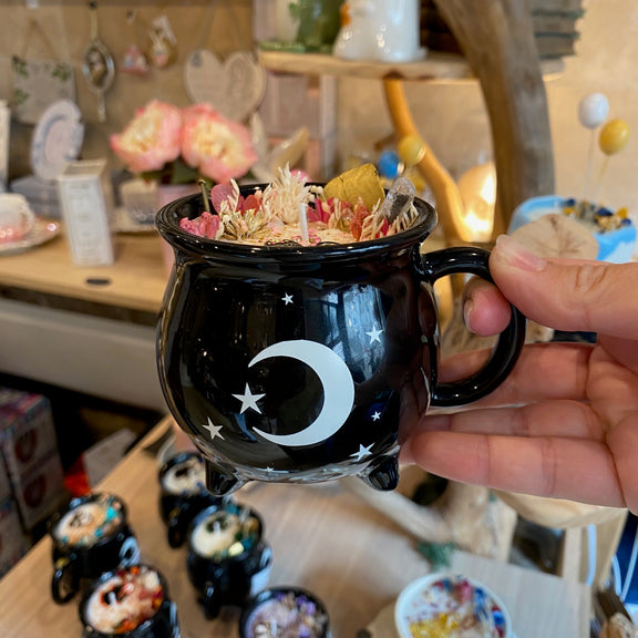 Plongez dans l’univers enchanté avec cette bougie unique, présentée dans un véritable petit mug en forme de chaudron noir orné d’un croissant de lune et d’étoiles de chaque coté. Une création exclusive Le Cerf aux Bois Dorés, imaginée comme un rituel lumineux à la fois décoratif et spirituel.