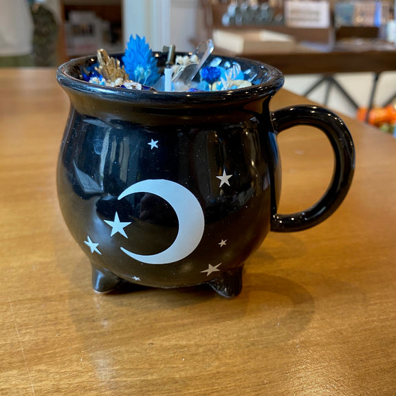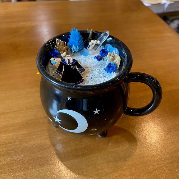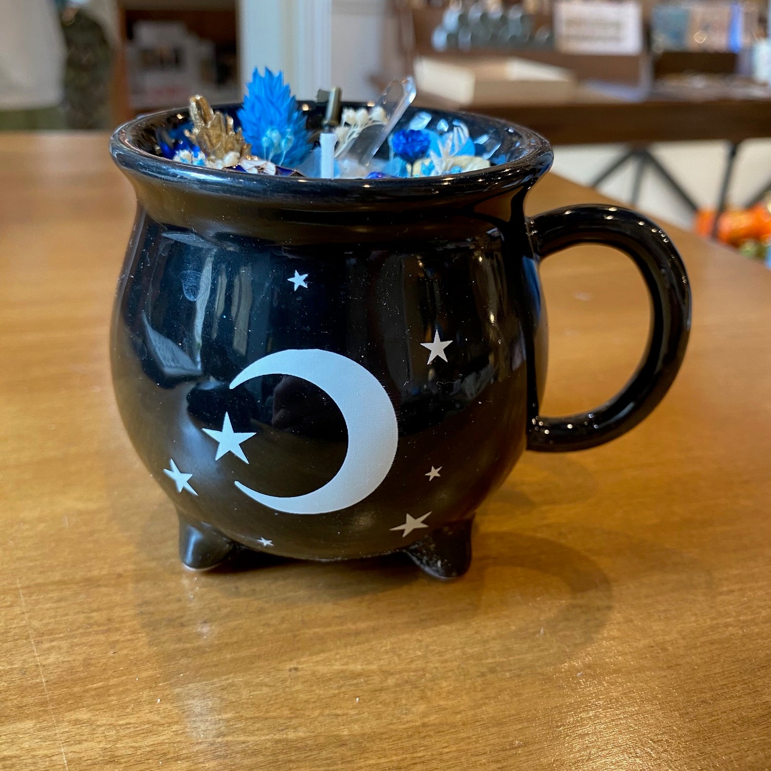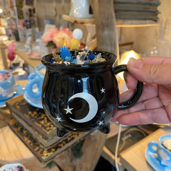 Plongez dans l’univers enchanté avec cette bougie unique, présentée dans un véritable petit mug en forme de chaudron noir orné d’un croissant de lune et d’étoiles de chaque coté. Une création exclusive Le Cerf aux Bois Dorés, imaginée comme un rituel lumineux à la fois décoratif et spirituel.