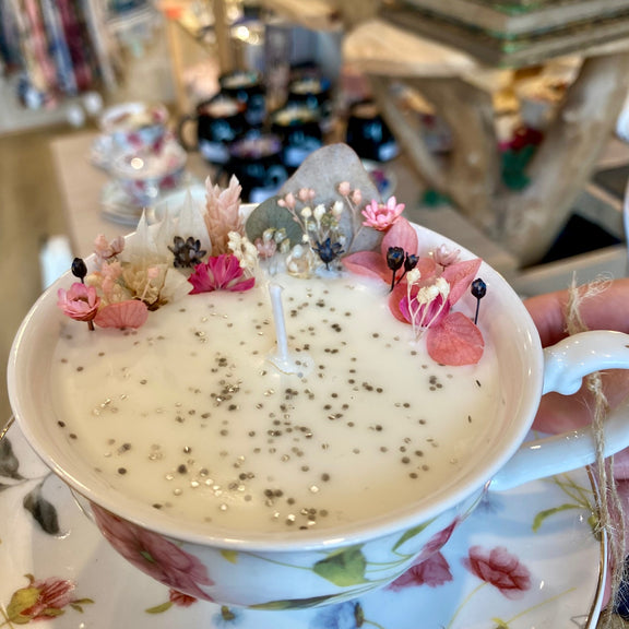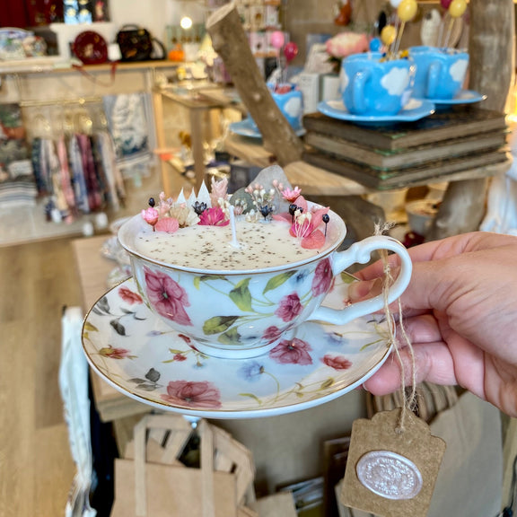 • Présentée dans une véritable tasse à thé fleurie avec sa soucoupe