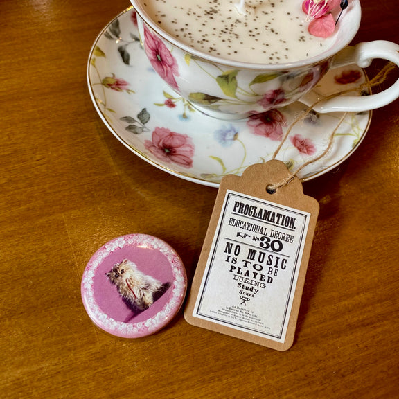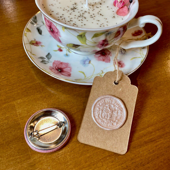 C’est dans cet esprit que j'ai imaginé cette collection de bougies artisanales exclusives, inspirée de son univers si singulier. Coulée dans une véritable tasse à thé fleurie, elle est décorée d’un petit badge « assiette de chat » que vous pourrez conserver et porter en broche ou sur votre sac.
