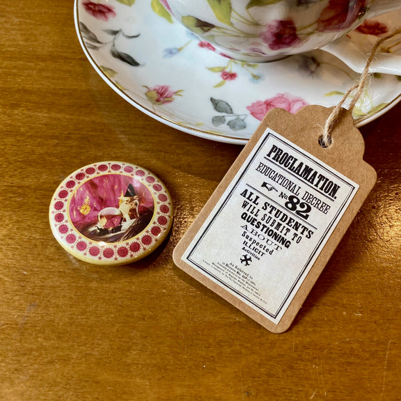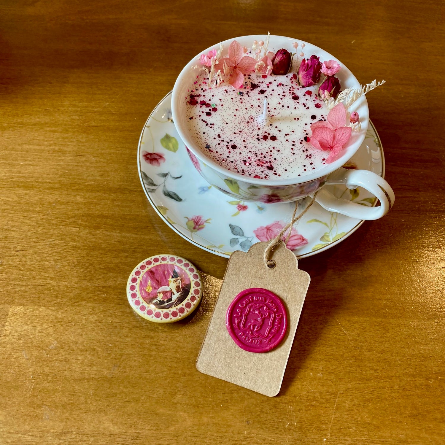 C’est dans cet esprit que j'ai imaginé cette collection de bougies artisanales exclusives, inspirée de son univers si singulier. Coulée dans une véritable tasse à thé fleurie, elle est décorée d’un petit badge « assiette de chat » que vous pourrez conserver et porter en broche ou sur votre sac.