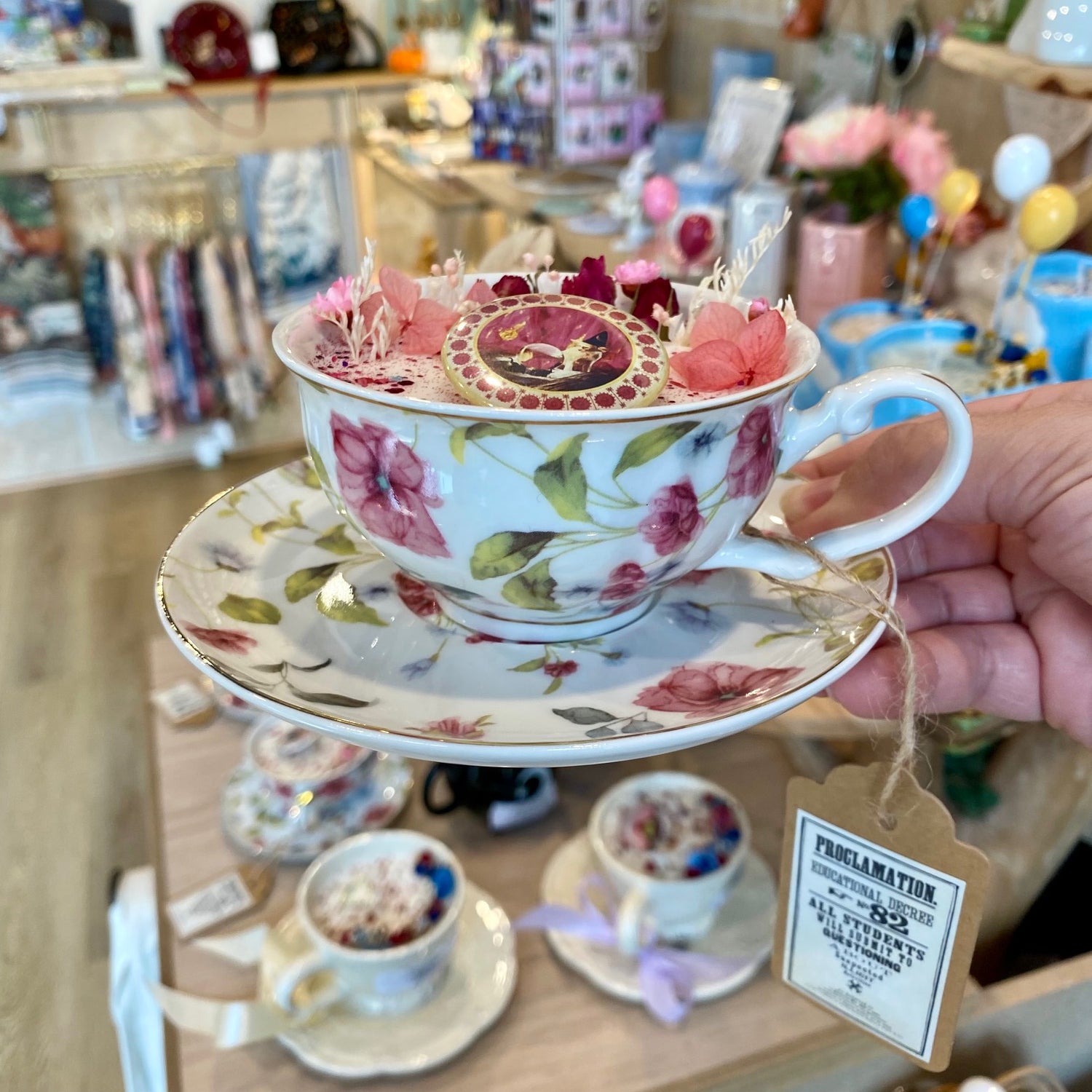 • Présentée dans une véritable tasse à thé fleurie avec sa soucoupe
