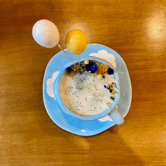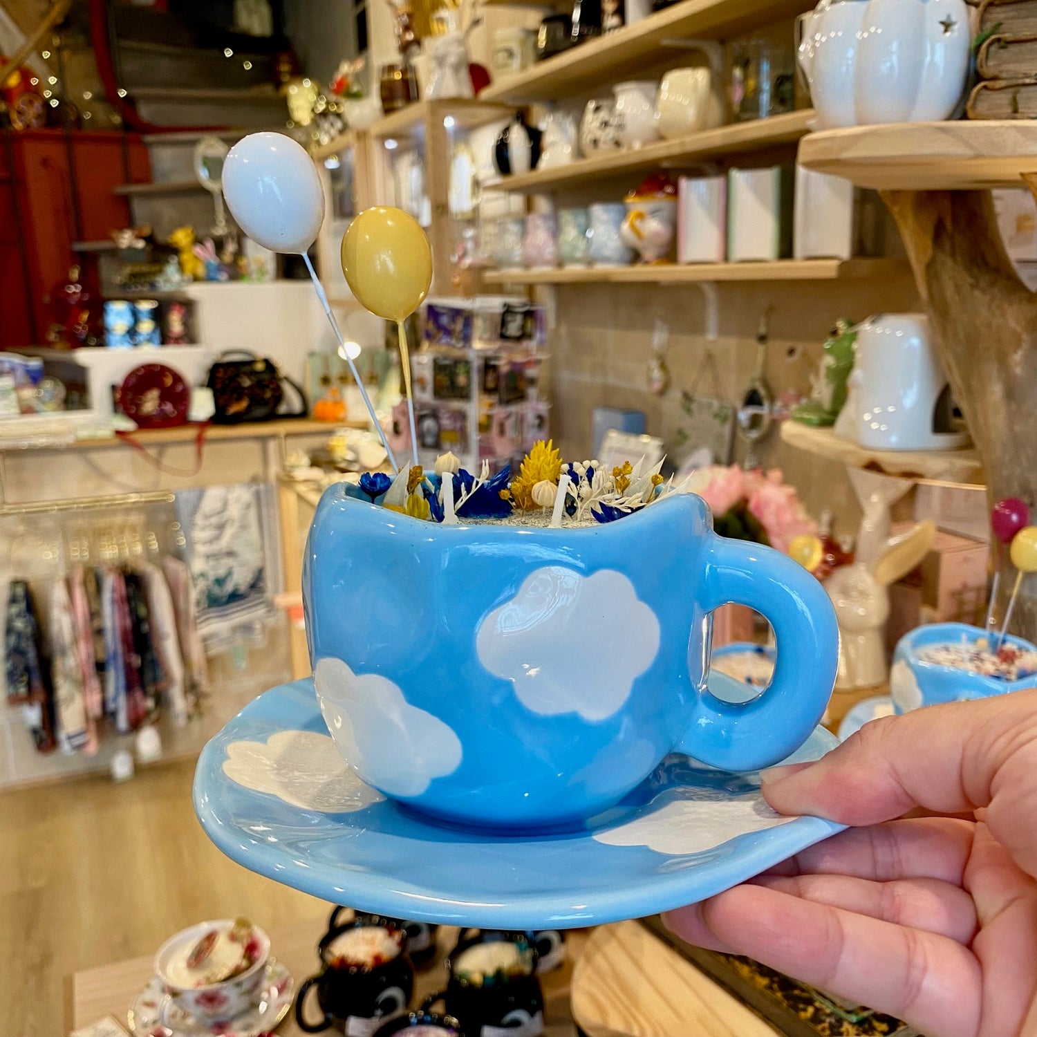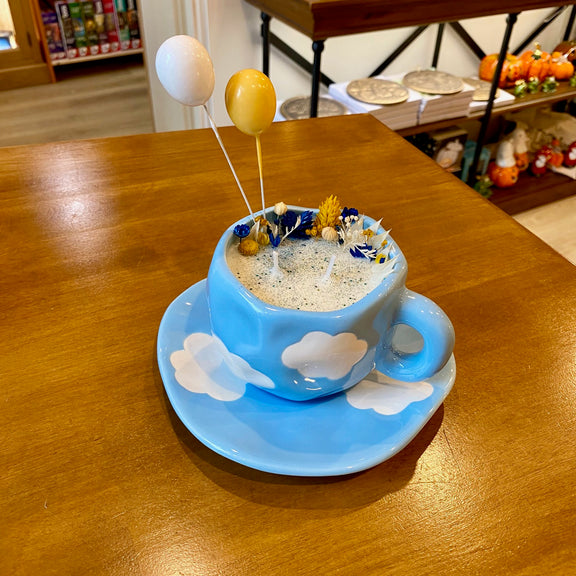 • Présentée dans une tasse en céramique bleue avec nuages + soucoupe assortie