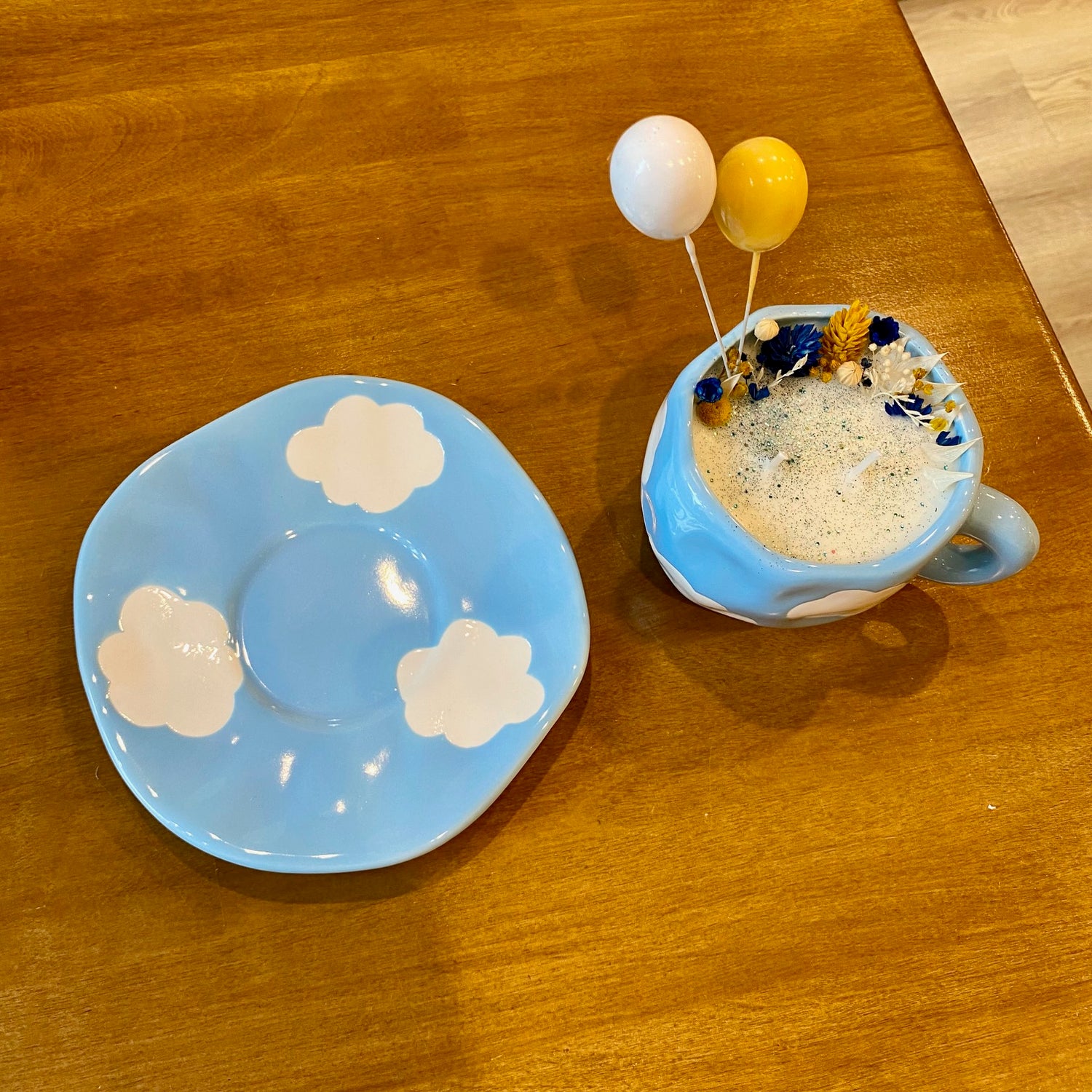Plongez dans la poésie d'un voyage aérien avec cette bougie exclusive, coulée artisanalement dans une grande tasse en céramique ornée de nuages et accompagnée de sa soucoupe assortie. Les ballons décoratifs apportent une touche féerique et festive, rappelant l'évasion et les rêves d'enfance.