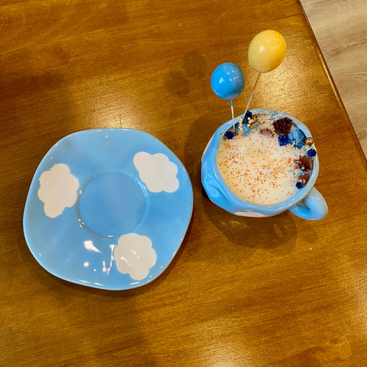 Plongez dans la poésie d'un voyage aérien avec cette bougie exclusive, coulée artisanalement dans une grande tasse en céramique ornée de nuages et accompagnée de sa soucoupe assortie. Les ballons décoratifs apportent une touche féerique et festive, rappelant l'évasion et les rêves d'enfance.