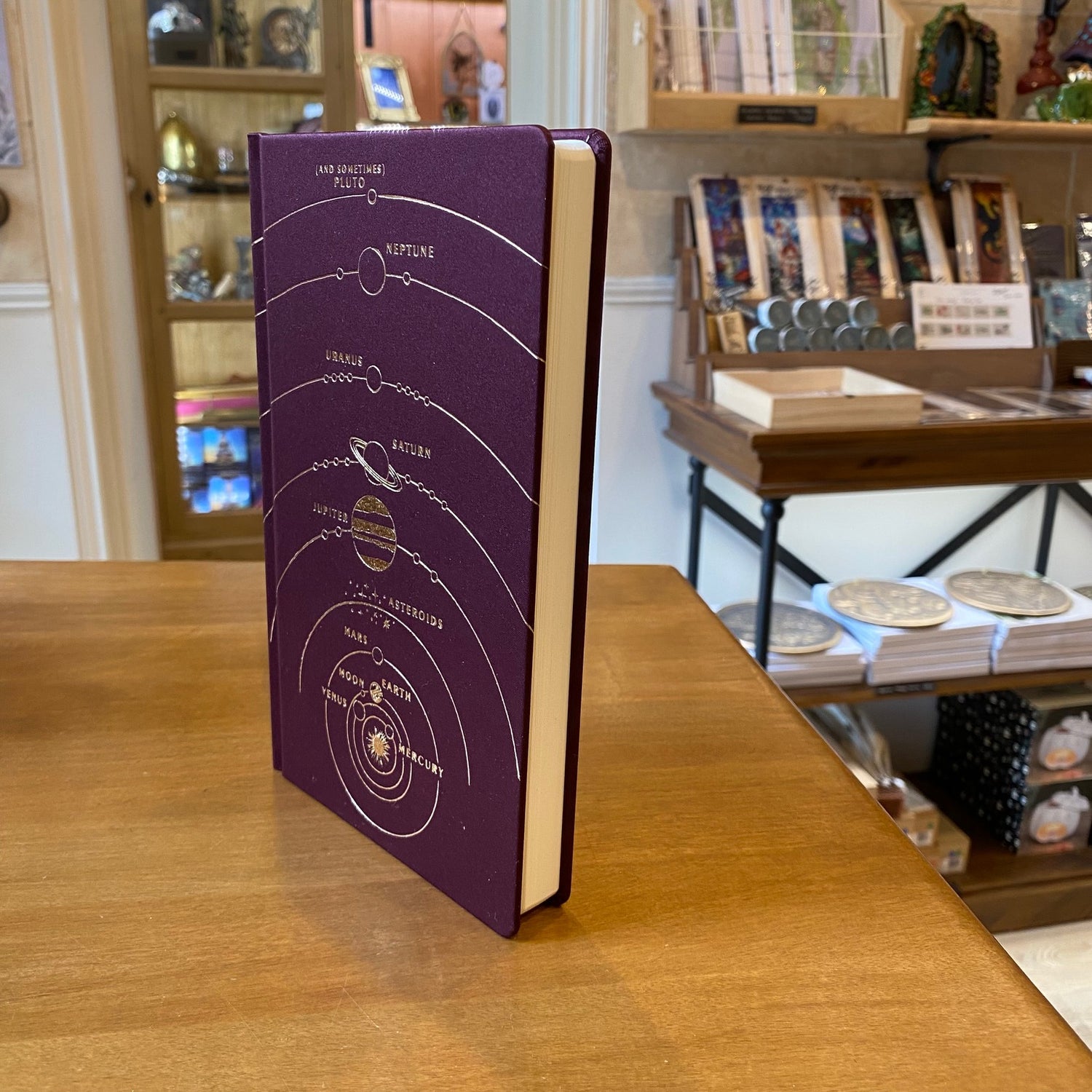 Couverture rigide en tissu bordeaux, décor doré du système solaire