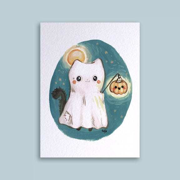 Plongez dans l'univers malicieux de Loeff Création avec cette carte postale illustrée d'un chat noir déguisé en fantôme . Une scène à la fois tendre et espiègle, parfaite pour célébrer l'automne ou Halloween avec une touche d'humour et de douceur.