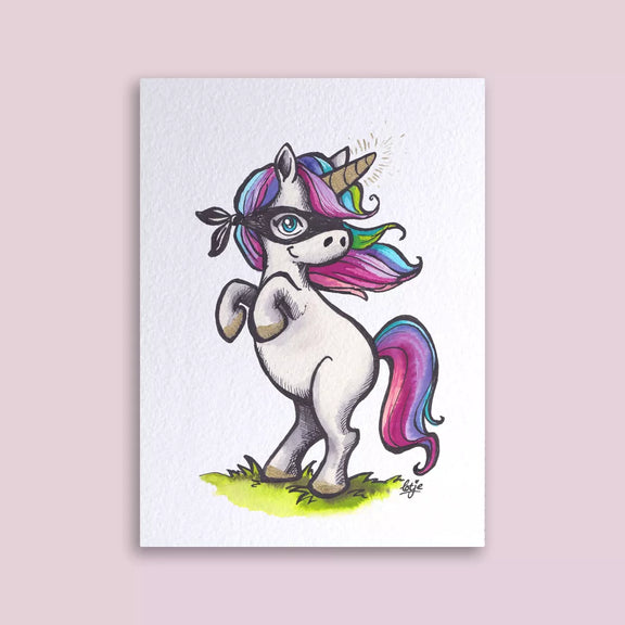 Apportez une touche de fun et de magie à votre quotidien avec cette carte postale illustrant une licorne masquée haute en couleurs ! Avec sa crinière arc-en-ciel, son regard malicieux et son masque noir de super-héroïne, cette licorne signée Loeff Création est prête à enchanter petits et grands.