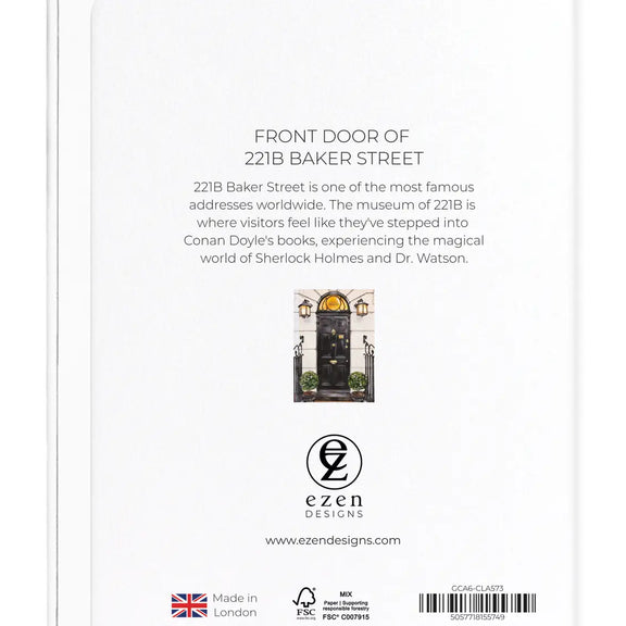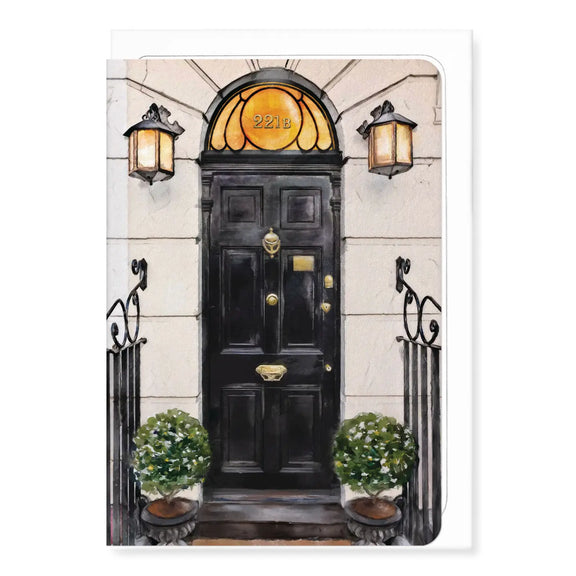 Offrez une touche d’élégance londonienne et de mystère littéraire avec cette carte représentant la fameuse porte noire du 221B Baker Street, adresse mythique de Sherlock Holmes et du Dr Watson. Avec ses lanternes victoriennes, son heurtoir doré et ses arbustes taillés avec soin, cette illustration rend hommage à l’univers raffiné et intrigant des romans de Sir Arthur Conan Doyle.