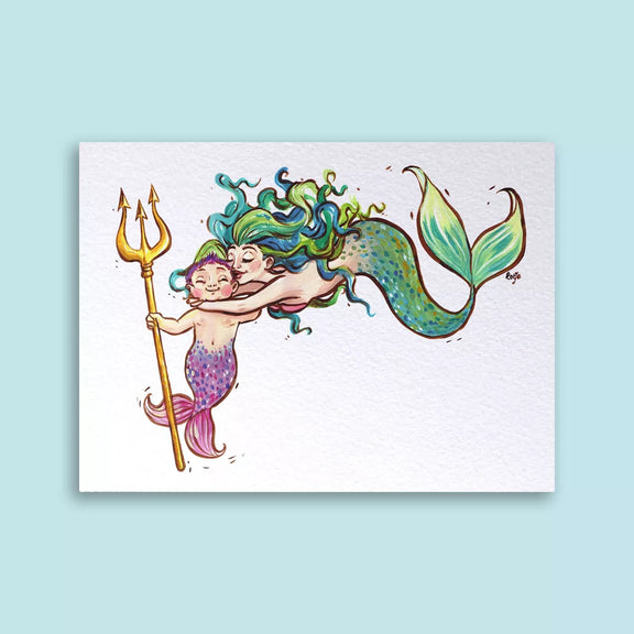 Plongez dans un océan de tendresse avec cette adorable illustration mettant en scène une sirène-maman qui enlace son petit triton. Entre cheveux ondulants, nageoires irisées et trident doré, cette carte transporte dans un univers marin féerique, empreint d’amour et de douceur.
