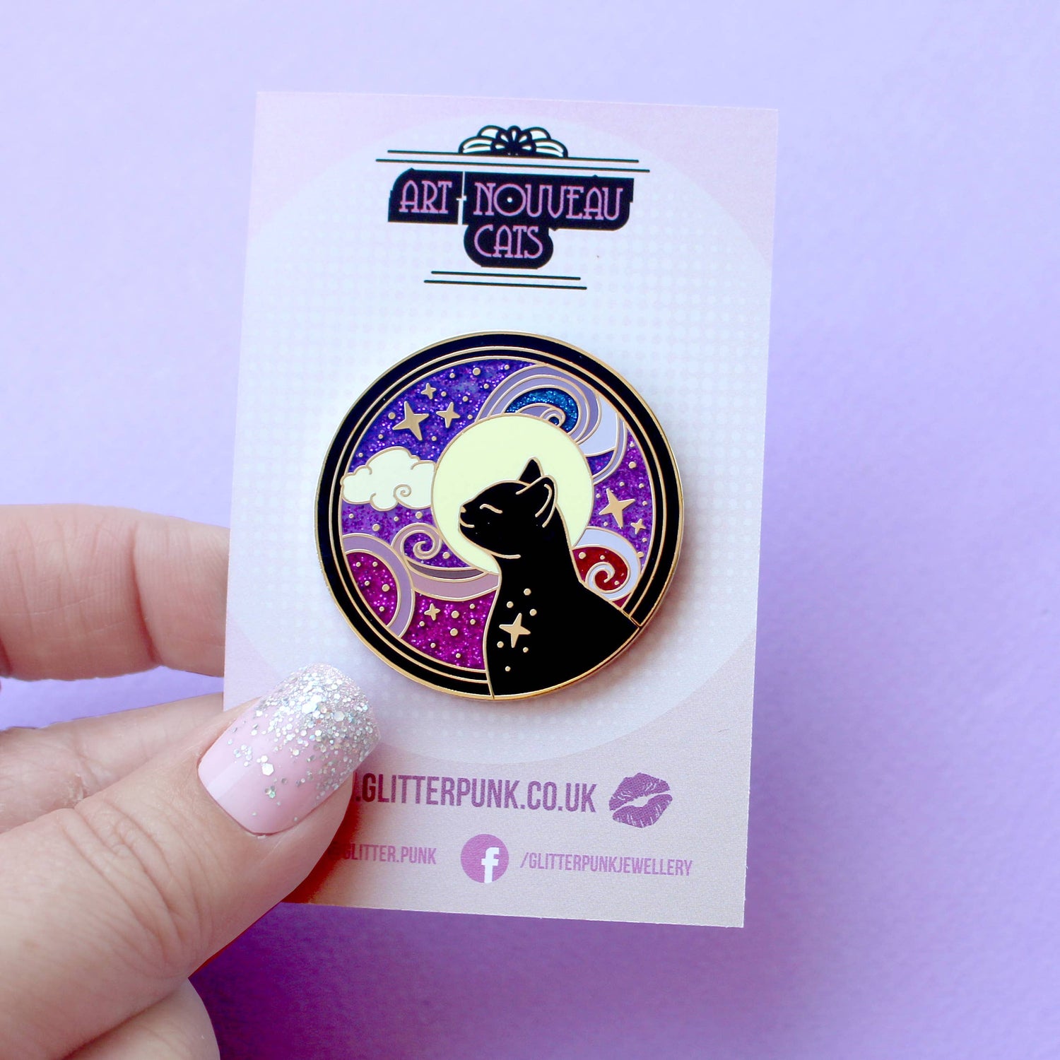 Plongez dans un univers céleste et artistique avec ce pin’s Art Nouveau représentant un chat noir cosmique contemplant la lune. Les volutes violettes et bleues pailletées qui ornent le fond évoquent les galaxies lointaines dans un style inspiré du mouvement Art Nouveau.