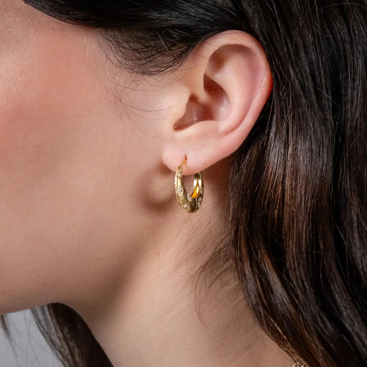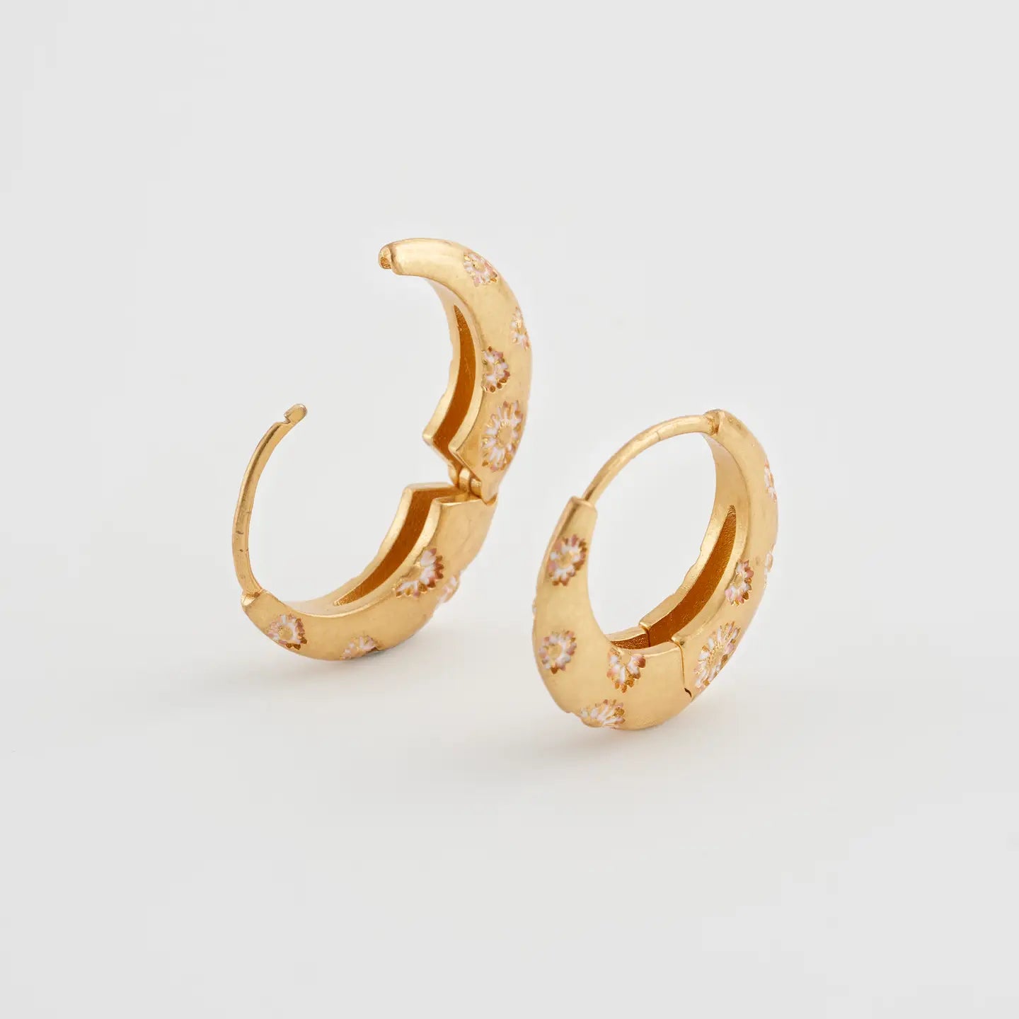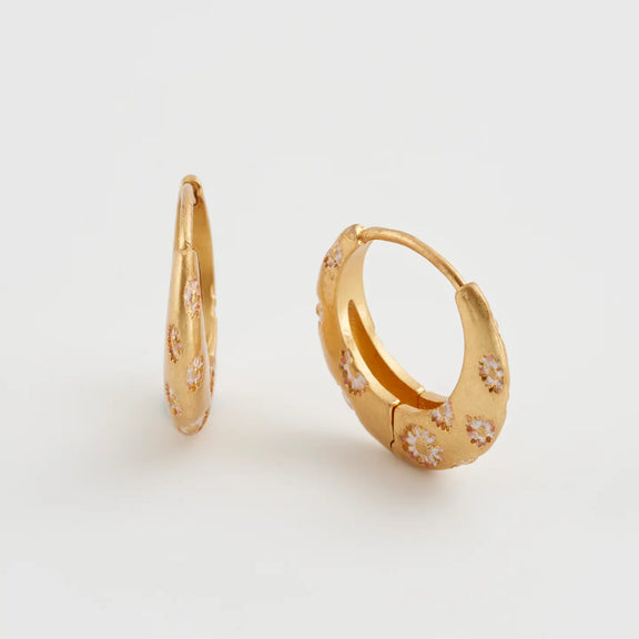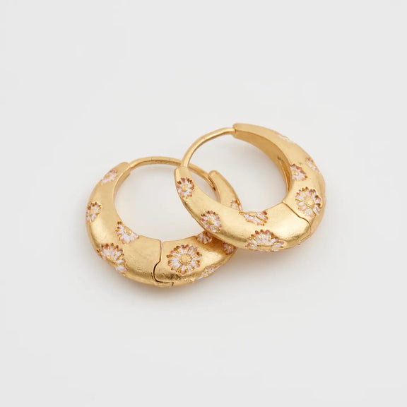 Ces créoles marguerite en plaqué or de la marque Fable England incarnent un équilibre subtil entre élégance florale et charme rétro. Leur surface travaillée, à l’aspect vieilli et légèrement texturé, leur confère une allure vintage raffinée qui rappelle les bijoux anciens.