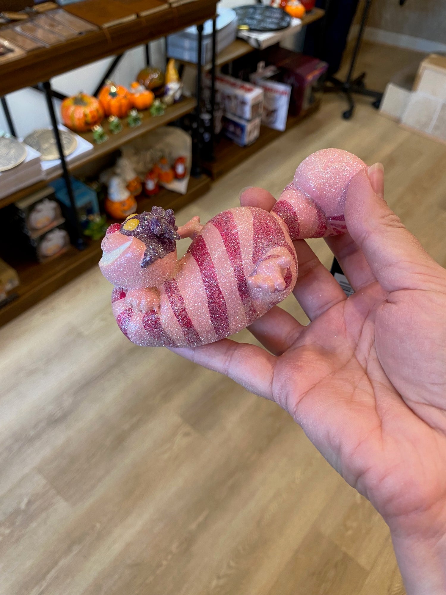 Faites sourire votre sapin avec cette décoration féerique du Chat du Cheshire ! Directement inspirée du célèbre personnage d’Alice au Pays des Merveilles de Disney, cette suspension en résine capte toute la malice et la fantaisie du plus énigmatique des félins. Ses rayures roses iconiques, son large sourire espiègle et ses paillettes scintillantes en font un ornement de choix pour une ambiance enchantée. Facile à suspendre grâce à sa ficelle noire, elle s’intègre à merveille dans un univers magique et coloré.