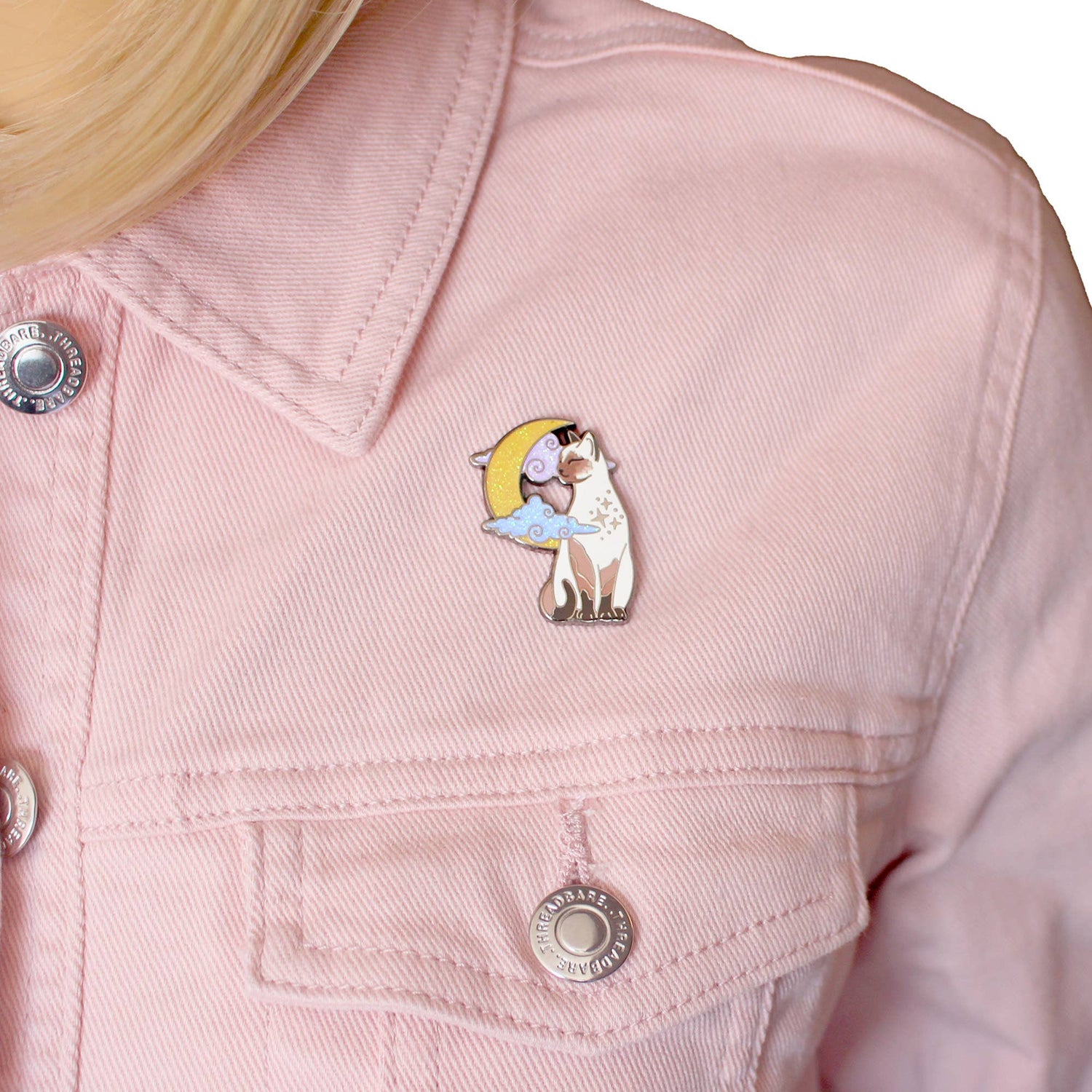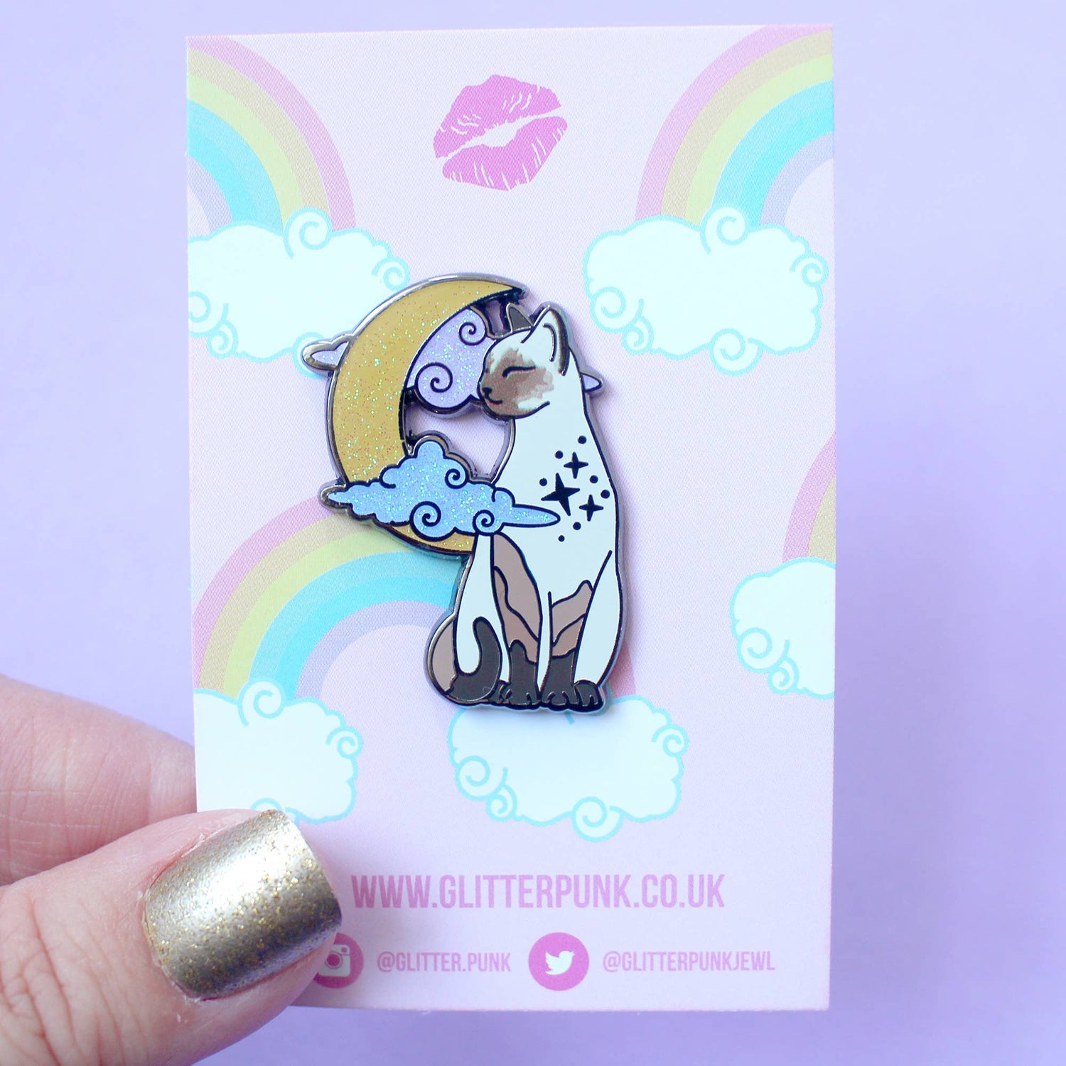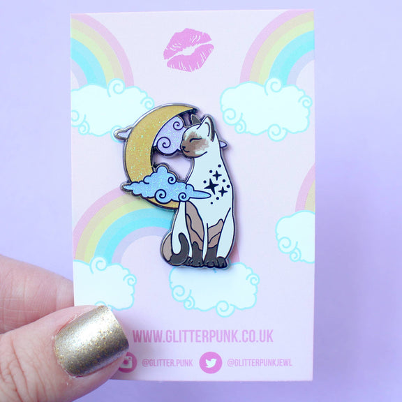 Offrez un hommage tendre à votre félin préféré avec ce pin’s en émail Chat, imaginé par Glitter Punk. Ce modèle représente un chat de type siamois, birman ou ragdoll, assis paisiblement devant une lune scintillante et des nuages pastels. L’expression détendue du chat et les détails pailletés en font un accessoire plein de charme.