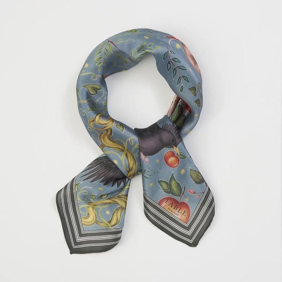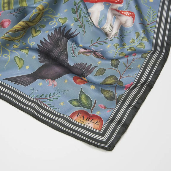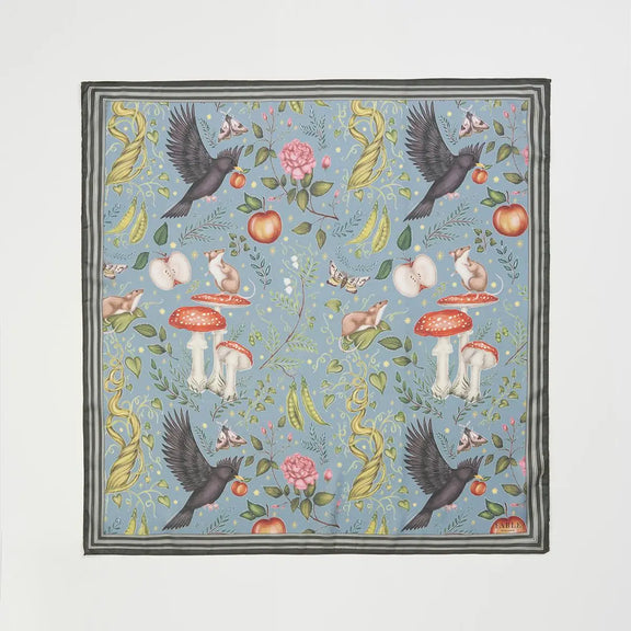 Laissez-vous envoûter par l’univers féerique du motif "Into the Woods", une création de l'artiste britannique Catherine Rowe pour Fable England. Ce foulard carré de 70 × 70 cm déploie un décor de forêt enchantée peuplée de souris, de corbeaux, de champignons rouges, de papillons et de pommes, dans une composition foisonnante et onirique.