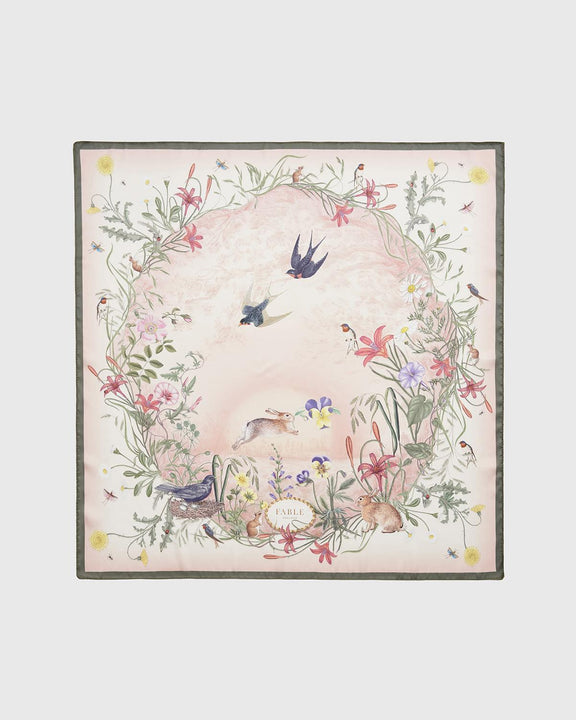 Plongez dans un univers de douceur et de fantaisie avec le foulard carré Bunny de Fable England, une pièce élégante qui évoque un voyage enchanteur dans le terrier du lapin. Sur son fond délicatement rosé se déploie une tapisserie florale raffinée, où se mêlent oiseaux en vol, lapins curieux et fleurs éclatantes, formant une composition poétique et pleine de vie.
