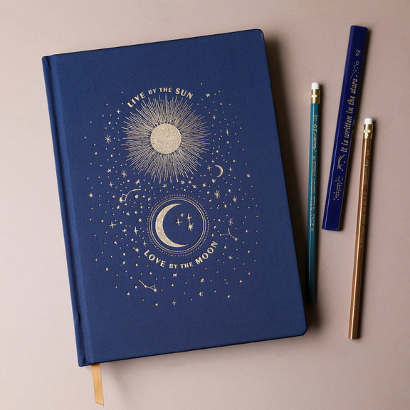 Écrivez vos pensées, projets ou rêves dans ce sublime carnet "Live by the Sun, Love by the Moon", orné de motifs célestes en feuille d’or. Sa couverture en tissu bleu nuit est enrichie de détails dorés en relief qui captivent le regard et apportent une élégance mystique à votre papeterie.