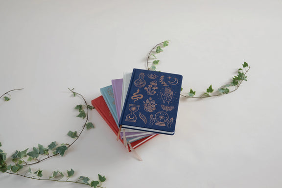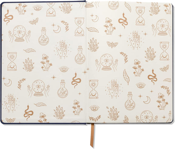 Organisez vos journées avec style grâce à ce somptueux carnet Designworks Ink, habillé d’une couverture bleu nuit en daim végétalien, ornée de symboles mystiques dorés : main de voyance, sablier, cristal, lune, serpent, œil protecteur… Un objet raffiné pour les passionnés d’ésotérisme et de papeterie élégante.