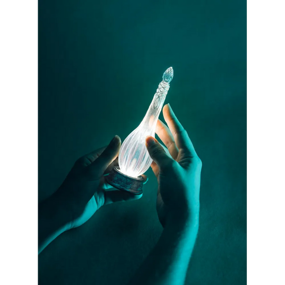 La lampe projette une douce lumière blanche et froide, parfaite pour une ambiance tamisée ou comme source de lumière originale sur un bureau, une table de chevet ou une étagère dédiée à votre collection. Sa forme élégante et ses finitions travaillées évoquent immédiatement les artefacts elfiques, et sa base finement sculptée rappelle les inscriptions anciennes de Lothlórien.