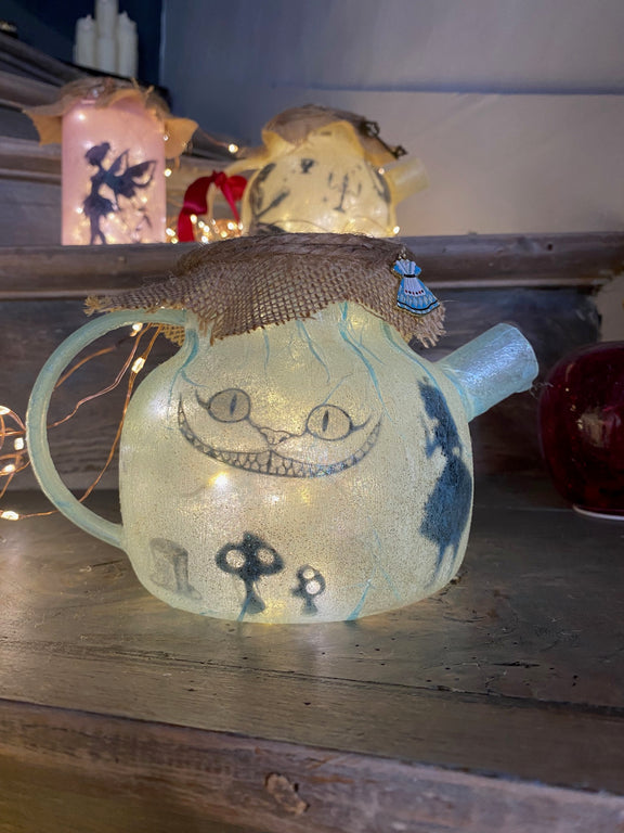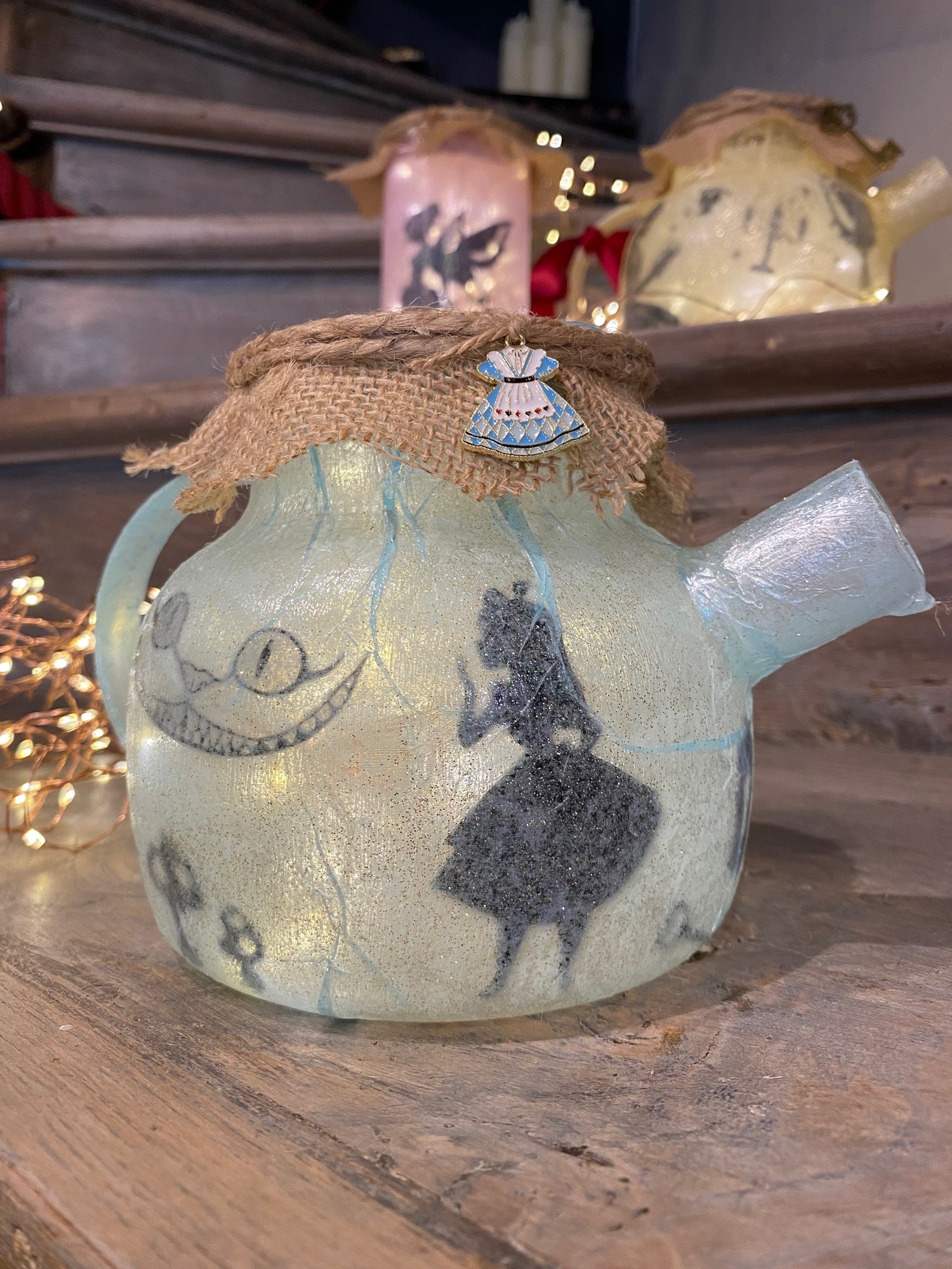 Apportez une touche de magie à votre intérieur avec cette lanterne artisanale unique, inspirée du célèbre conte intemporel Alice au Pays des Merveilles. Fabriquée à partir d’une véritable théière en verre, elle diffuse une douce lumière grâce à sa guirlande LED fournie, tout en révélant de délicats motifs emblématiques : silhouette d’Alice, sourire énigmatique du chat et éléments du pays des merveilles (clé, montre à gousset…).