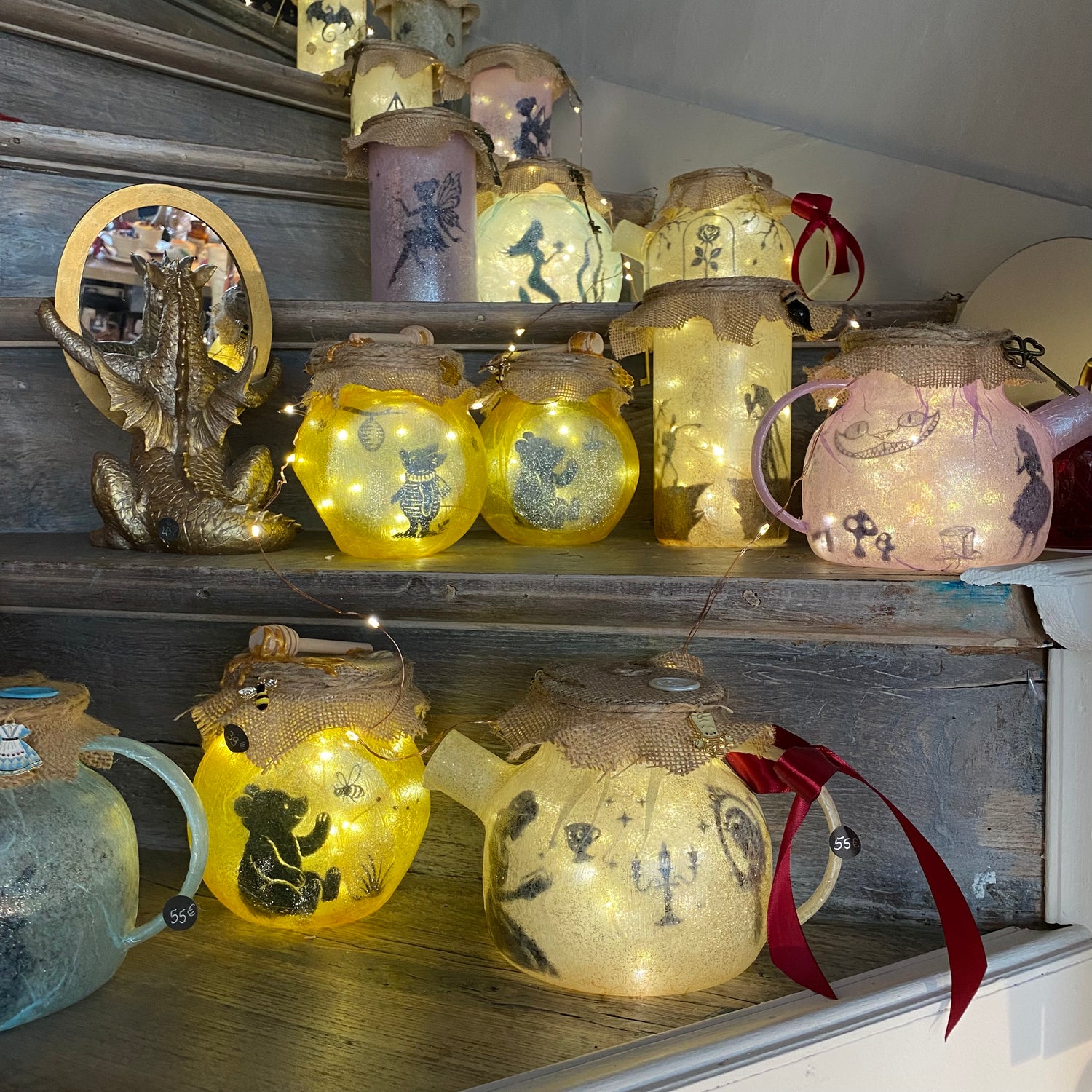 Façonnée à partir d’une réelle théière en verre, cette création unique diffuse une douce lumière grâce à sa guirlande LED fournie.