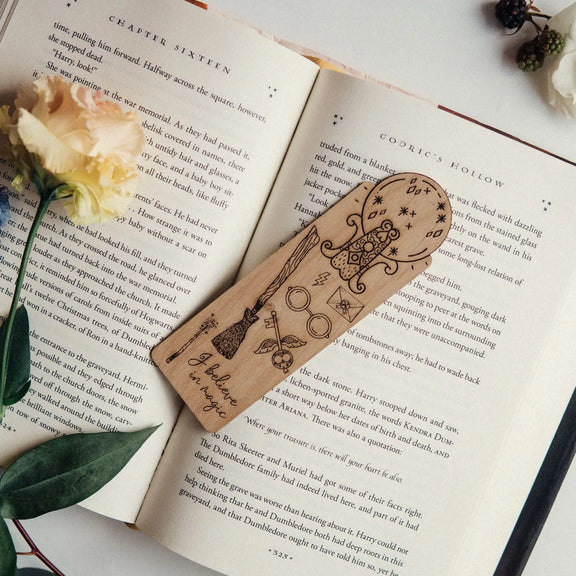 Ajoutez une touche d'enchantement à vos lectures avec ce marque-page en bois inspiré de l’univers de la magie et de la sorcellerie. Entièrement gravé au laser, il représente des symboles cultes et la citation "I believe in magic".