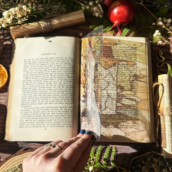 Laissez-vous transporter dans l’univers des légendes avec ce somptueux marque-page vitrail signé Sonnet & Fable. Réalisé en acrylique transparent, il capte la lumière comme un véritable vitrail ancien et illumine vos lectures d’une aura mystique. Son illustration représente une épée dressée, au pommeau orné et à la lame argentée, semblant jaillir du sol et entourée de motifs végétaux aux tons dorés et bruns.