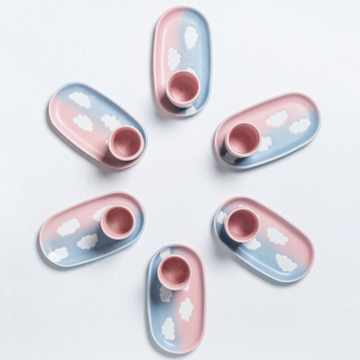 Apportez une touche poétique et apaisante à votre intérieur avec le mini plateau vide-poche Cloud Sunset signé Eggbach Home. Inspiré par la douceur des couchers de soleil, il associe des nuances dégradées de rose et de bleu pastel, ponctuées de jolis nuages blancs qui invitent à la rêverie.