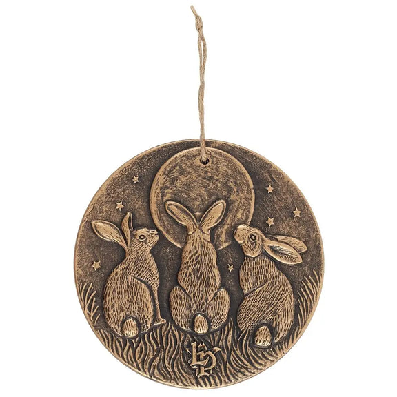 Plaque murale en terre cuite – Trois lapins et pleine lune – Effet bronze vieilli