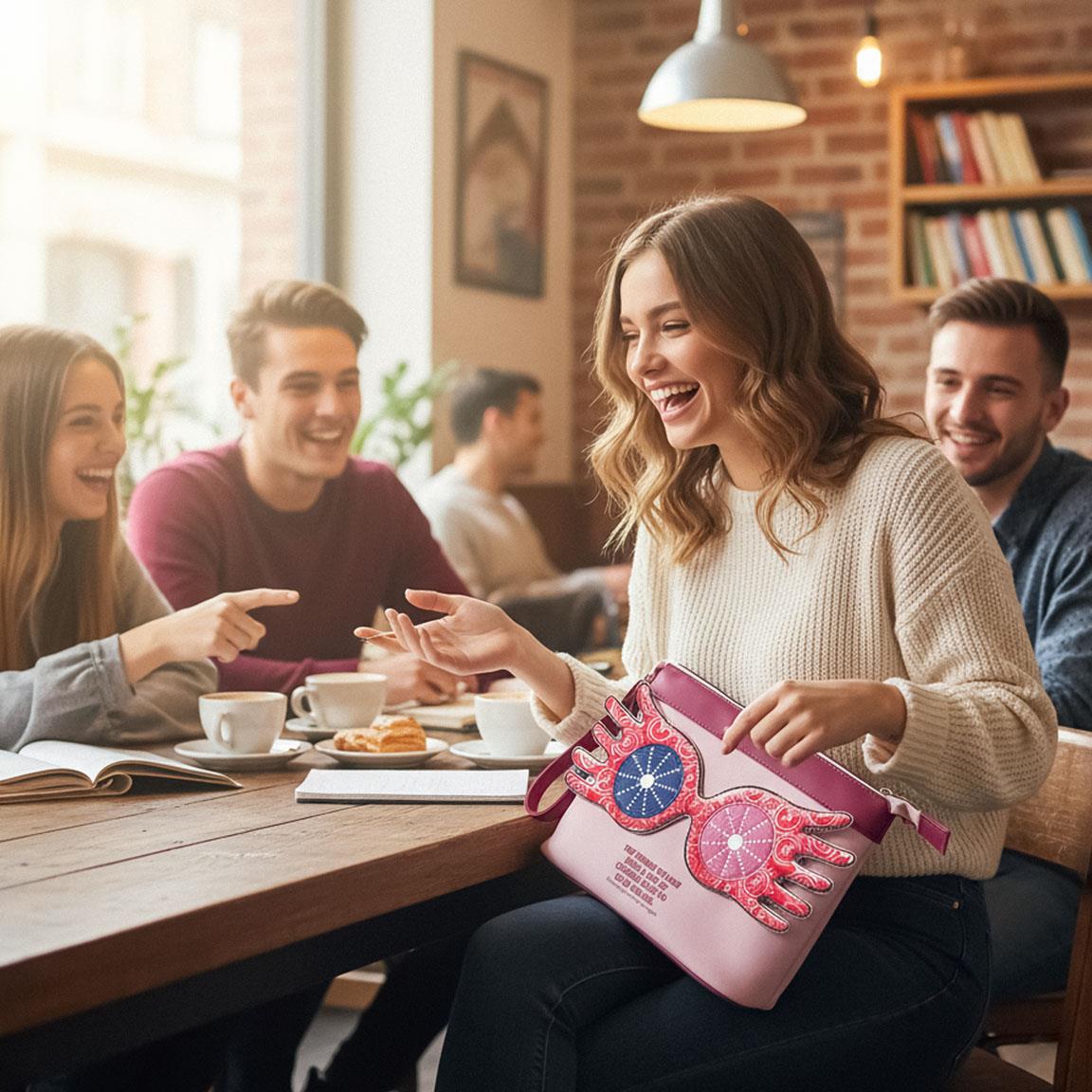 Sur la face avant, les grandes lunettes Lorgnospectres sont reproduites en appliques texturées, avec des détails scintillants qui attrapent la lumière comme un sortilège. Le célèbre motif circulaire est mis en valeur par un contraste brillant, donnant un aspect unique à cette pochette qui ne passe jamais inaperçue. Sous le motif, une citation inspirante rappelle que « The things we lose have a way of coming back to us in the end », une phrase iconique de l’univers magique.