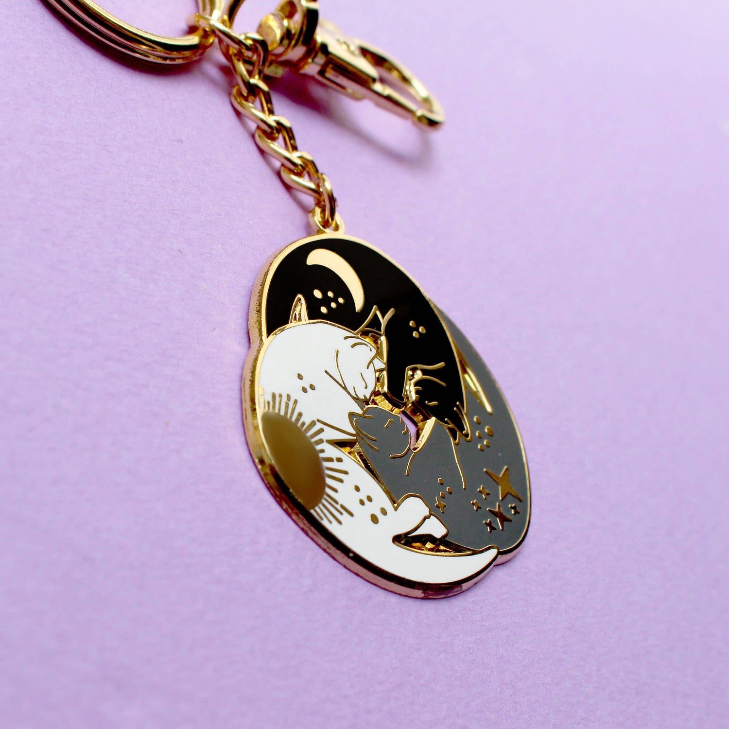 Difficile de résister à une bonne sieste… et ce trio de chats endormis l’a bien compris ! Représentant les astres célestes — le soleil, la lune et les étoiles, ce porte-clés en émail doré de 40 mm ajoute une touche magique et poétique à vos affaires. Parfait pour les amateurs de chats, de nuit et de cosmos !