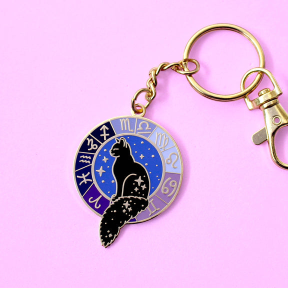 Le mystère des étoiles rencontre l’élégance féline avec ce porte-clés astrologique Glitter Punk. Un chat noir cosmique trône fièrement au centre d’un cercle orné des 12 signes du zodiaque, sous un ciel étoilé en dégradé violet et bleu. Un accessoire idéal pour les amoureux des astres, des chats et du symbolisme céleste.