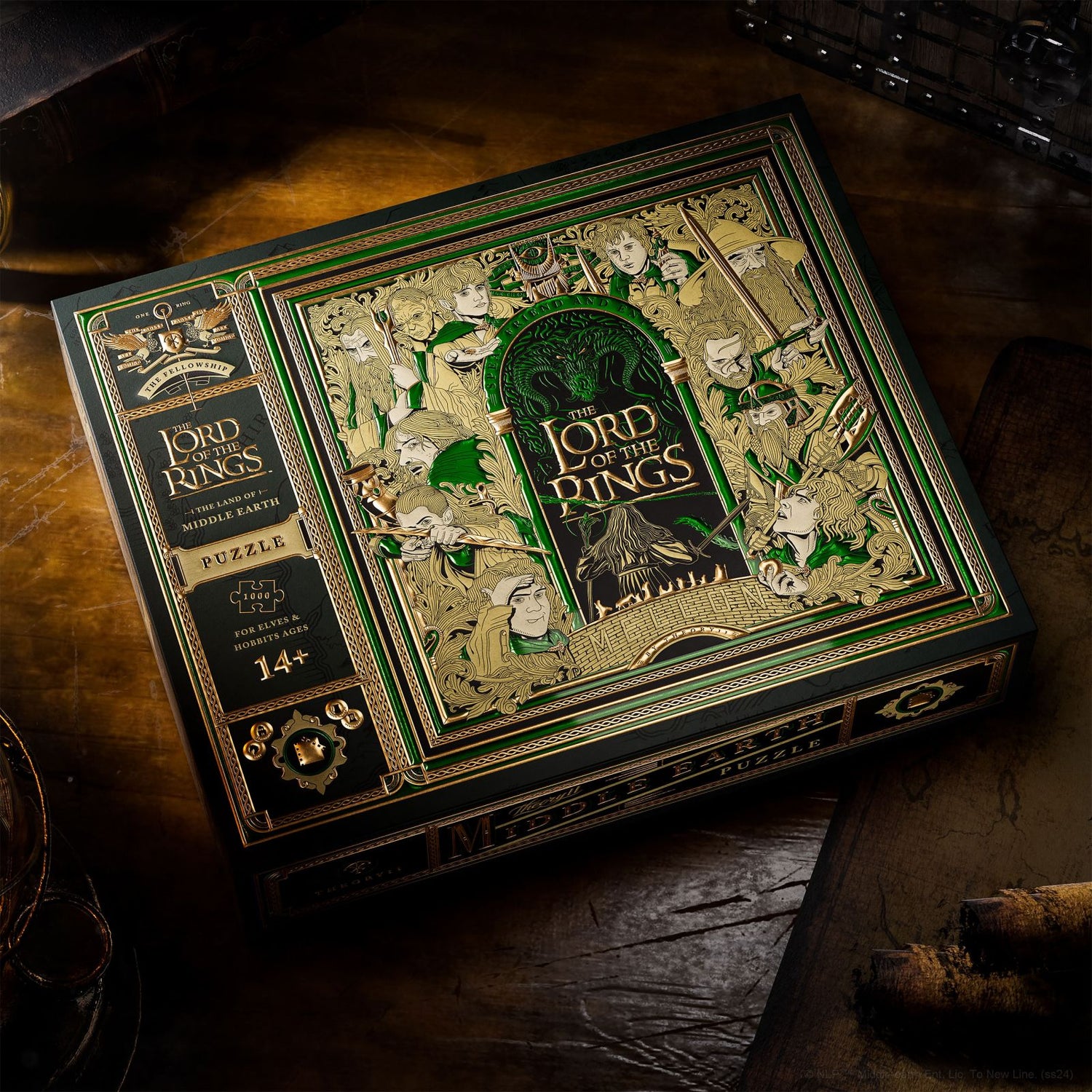 Plongez dans le monde épique de Tolkien avec ce puzzle jigsaw premium signé Theory11, composé de 1000 pièces raffinées. Le design exclusif s’inspire des motifs du jeu de cartes The Lord of the Rings, et chaque pièce arbore des éléments dorés et verts métallisés pour un rendu visuel spectaculaire.