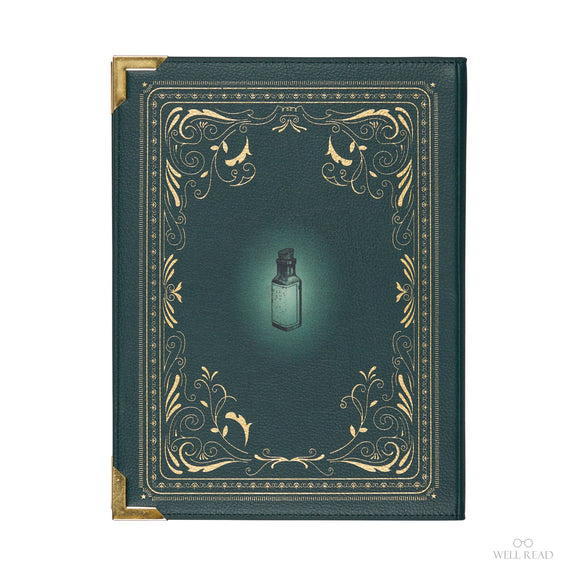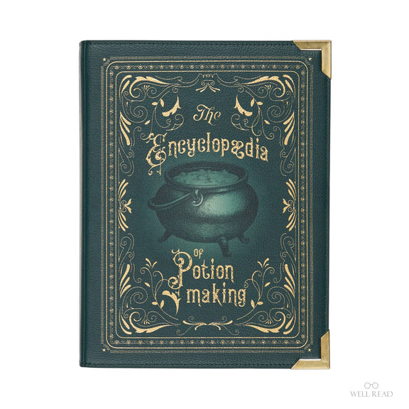 Affirmez votre passion pour les univers mystiques avec ce sac à main L’Encyclopédie de la Fabrication de Potions, conçu comme un véritable livre ancien. Sa couverture vert profond ornée de motifs dorés et d’un chaudron central évoque les grimoires d’apothicaires et les bibliothèques feutrées.