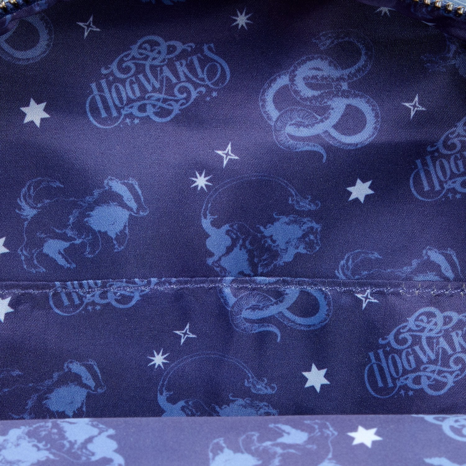 Les détails métalliques — étoiles, Vif d’Or et charms décoratifs — ajoutent une touche raffinée, tandis que les franges en faux jean apportent un effet texturé unique. Pratique et robuste, ce sac en similicuir (polyuréthane) comprend une poignée supérieure, des bretelles réglables, une poche frontale à rabat et deux poches latérales. À l’intérieur, la doublure imprimée reprend les emblèmes de Poudlard dans des tons bleus profonds.