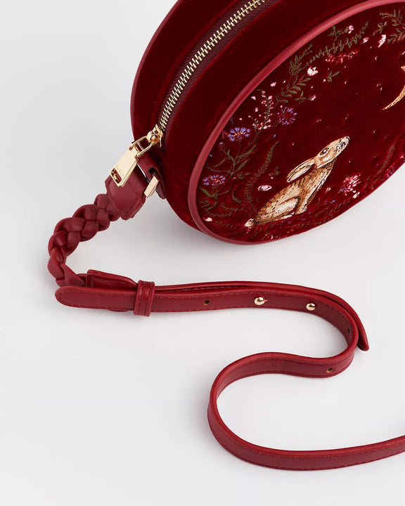 Plongez dans l’univers enchanté de la forêt d’hiver avec ce sac rond en velours rouge profond, véritable bijou de la collection Fable England. Sur sa face avant, un lièvre rêveur lève les yeux vers une lune dorée, entouré de fleurs sauvages brodées aux teintes délicates et d’étoiles scintillantes. Ce motif inspiré des contes folkloriques évoque la magie paisible des nuits de solstice.