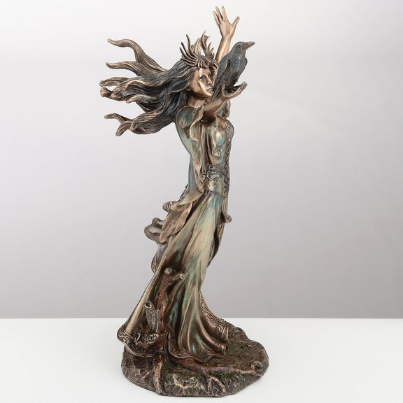 La sculpture représente Morgane dans un mouvement dramatique, les bras levés vers le ciel, un corbeau posé sur sa main — symbole de sagesse, de prophétie et de lien avec l’Autre Monde. Sa chevelure sculptée semble balayée par un vent invisible, donnant à l’ensemble une impression de vie et d’énergie. Sa robe fluide, richement détaillée, est ornée de motifs délicats et d’un travail minutieux sur les textures.