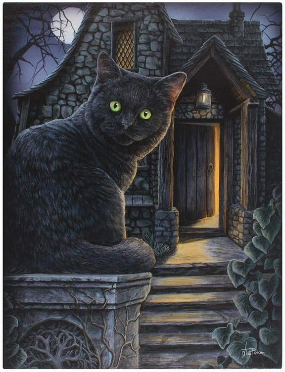 Tableau décoratif – Chat noir mystérieux devant manoir gothique - Lisa Parker