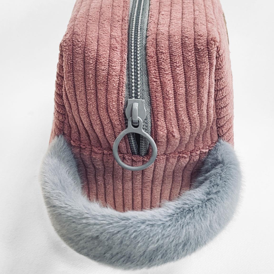 Trousse Bambi – Tissu côtelé rose & poignée fourrure grise